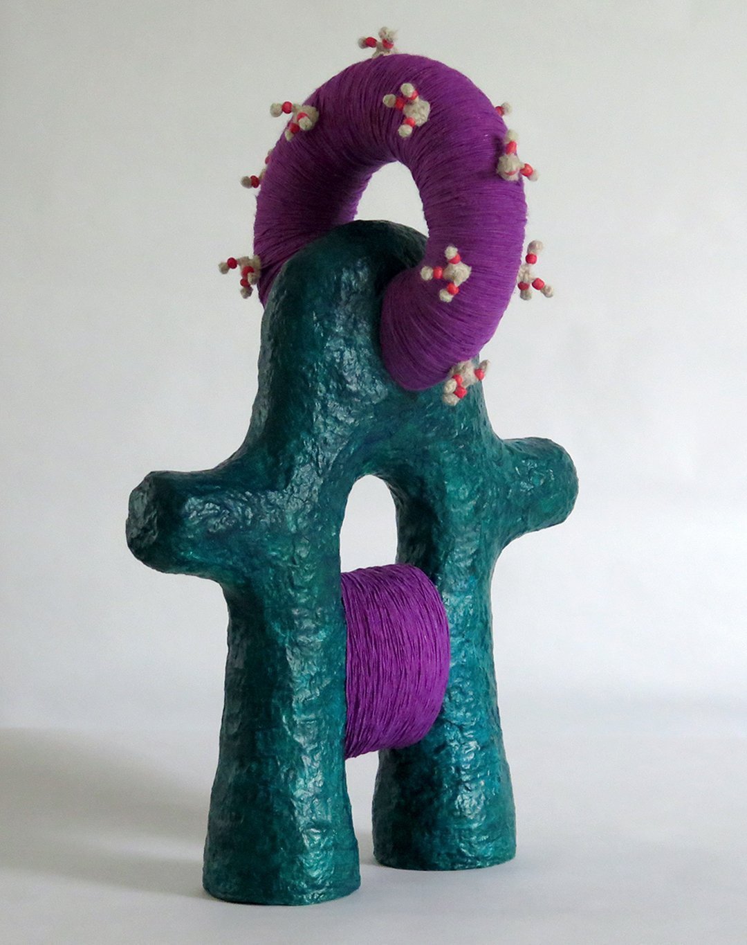 Stack, 2020, paper, paint, wire, crocheted and wrapped textiles, 7" x 13" x 7"