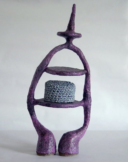 Stack, 2020, paper, paint, wire, crocheted and wrapped textiles, 7" x 13" x 7"