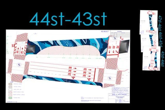 The color palette of cool blues alludes to the historical geography of midtown, especially the Great Kill stream that once flowed near contemporary Times Square. The cool colors were chosen to make the plazas more calm and comfortable for pedestrians, and to contrast with the reds and yellows of the neon billboards.